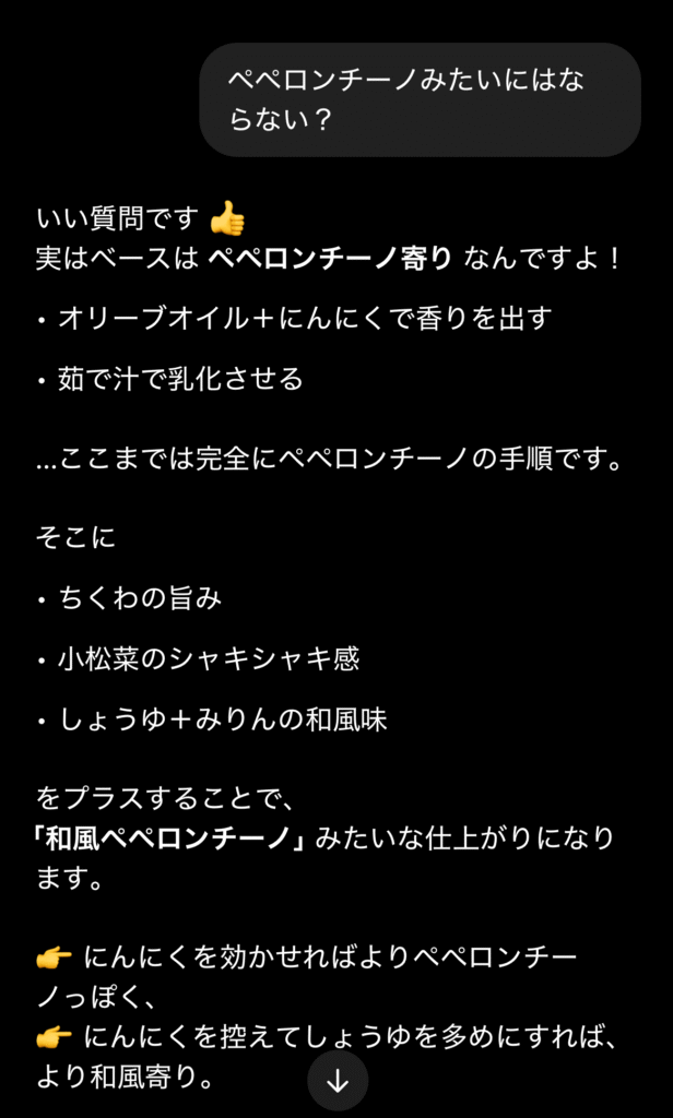 たとえば、材料は和風なんだけどペペロンチーノ食べたいなって思ったときの私の例