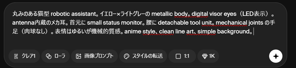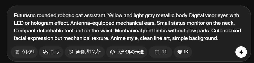 「丸みのある猫型 robotic assistant。イエロー×ライトグレーの metallic body。digital visor eyes(LED表示)。antenna内蔵のメカ耳。首元に small status monitor。腰に detachable tool unit。mechanical joints の手足(肉球なし)。表情はゆるいが機械的質感。anime style、clean line art、simple background。」