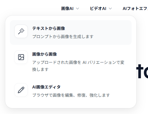 「テキストから画像」「画像から画像」など