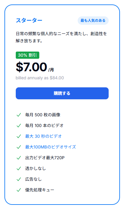 年額プランだと割安で月当たり7$(約1000円前後)でもっとたくさん使えるようになります。